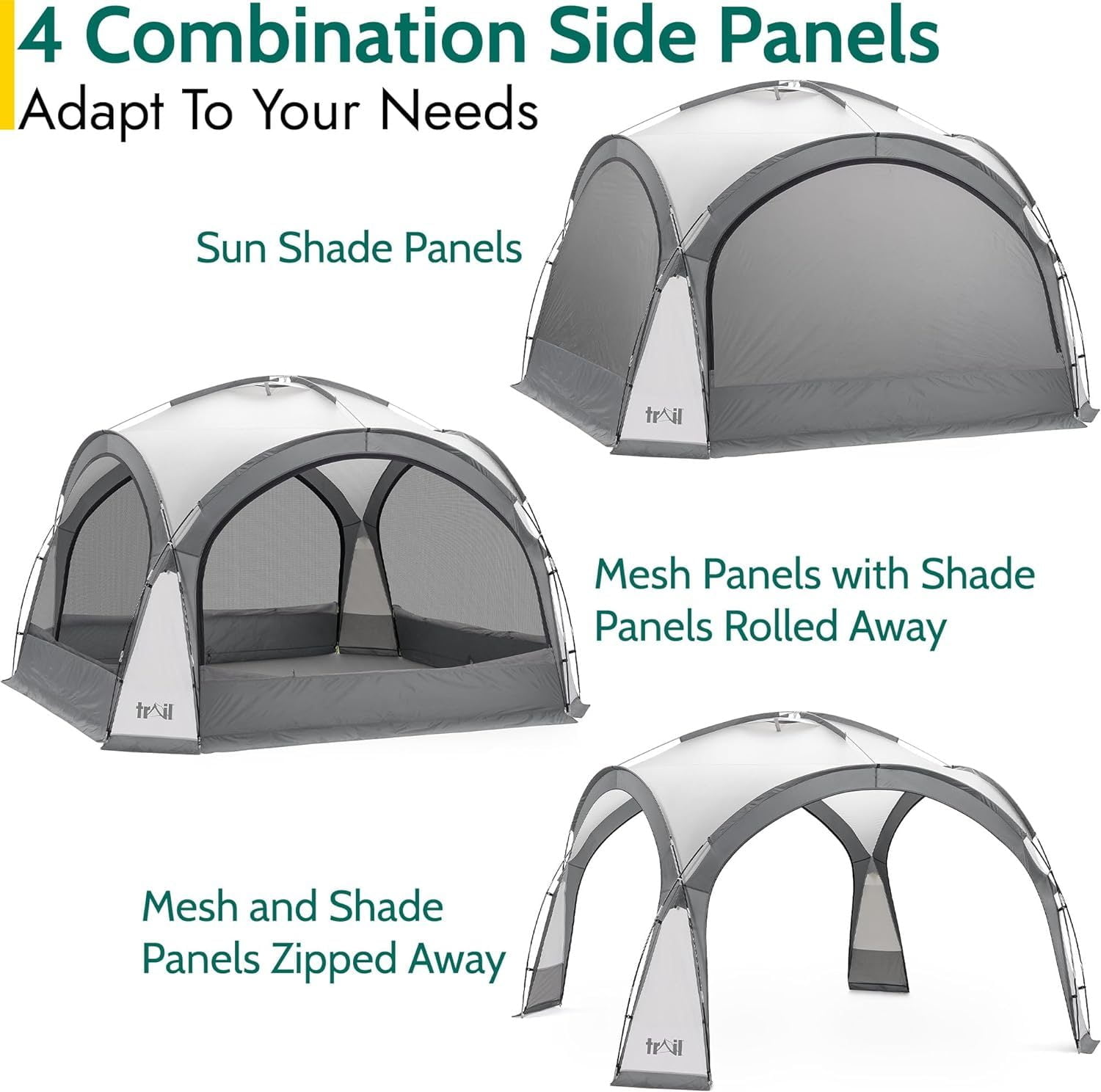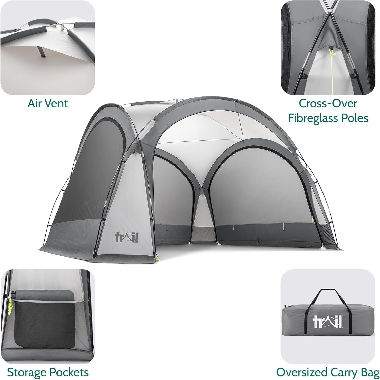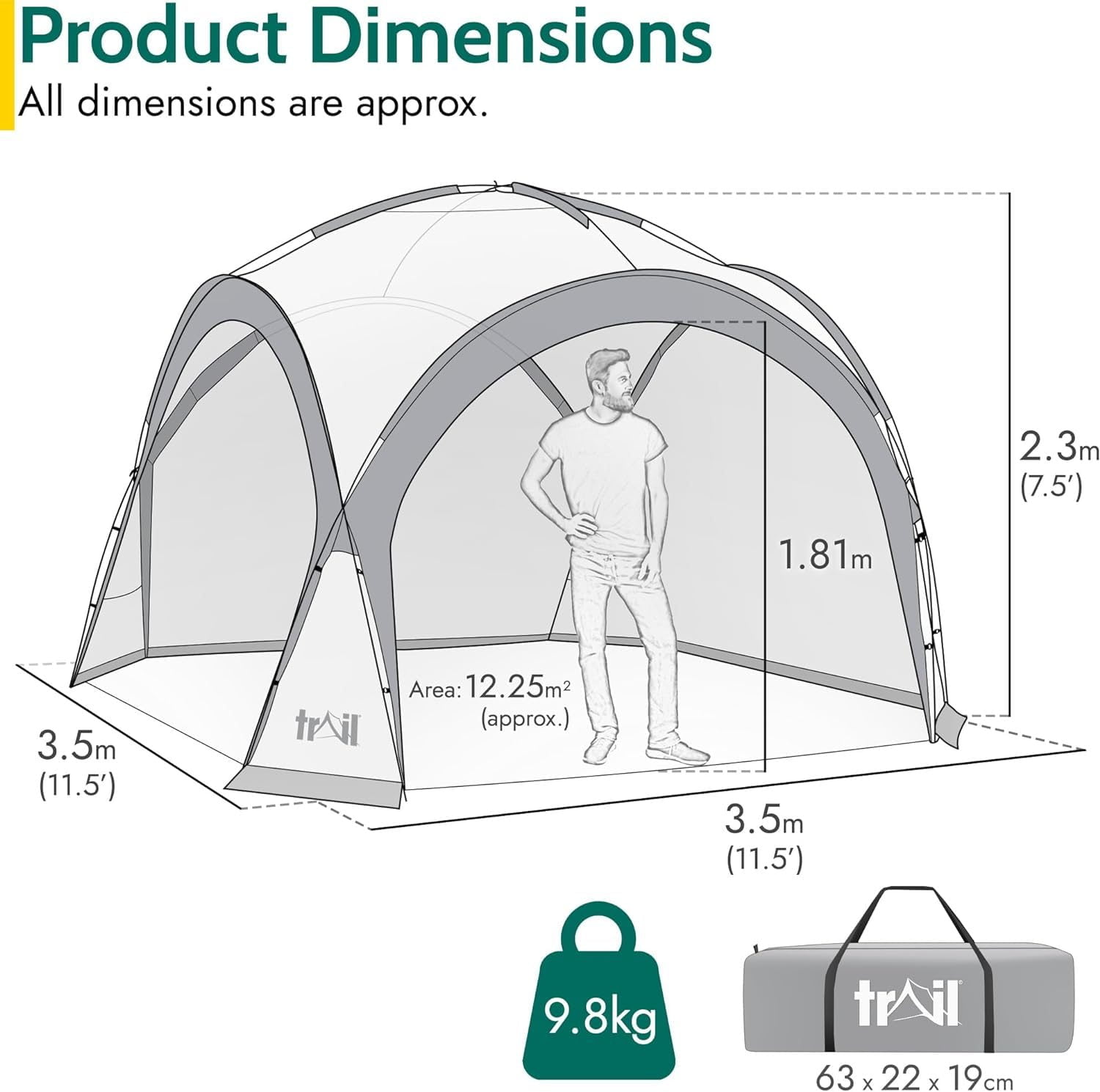 - EXCEPTIONAL SUN & RAIN PROTECTION: Compact to carry and easy to pitch, the Trail Dome Gazebo is perfect for garden parties, outdoor events, camping, and more. Rated UPF50+ with a 2000mm Hydrostatic Head (waterproof rating) for exceptional sun and rain protection. It has four zip-away side panels for easy access and measures a spacious L3.5m x W3.5m x H2.3m when pitched.4 COMBINATION SIDE PANELS: Each side features an outer mesh panel with a sunshade panel zipped onto the inside. Keep the sunshade panels up to block sun, wind, and rain. Unzip, roll away, and secure them using toggle attachments to expose the outer mesh. This setup is perfect for increasing light and ventilation while maintaining privacy and keeping insects out.DURABLE TRX 190T POLYESTER FABRIC: The shelter uses TRX 190T polyester fabric with 150D pole sleeves to protect from snags, rips, and tears. An extended floor valance seals the sides from damp, draughts, and insects. The roof vent aids air flow and reduces condensation. Internal pockets provide handy storage for the removable side panels and personal belongings.STRONG, STABLE & SPACIOUS DESIGN: The improved geodesic design with cross-over poles and roof poles offers plenty of height and space. Colour-coded fibreglass poles and pole sleeves make the shelter easy to pitch. Cross-over pole support loops add superior strength at all cross-over points. Pegging and guying points are reinforced with extra stitching for ultimate strength and stability.